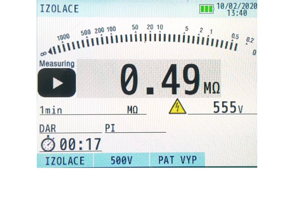 - Izolace: test izolačního odporu při 100, 250, 500 a 1 000 V s automatickým vybíjením